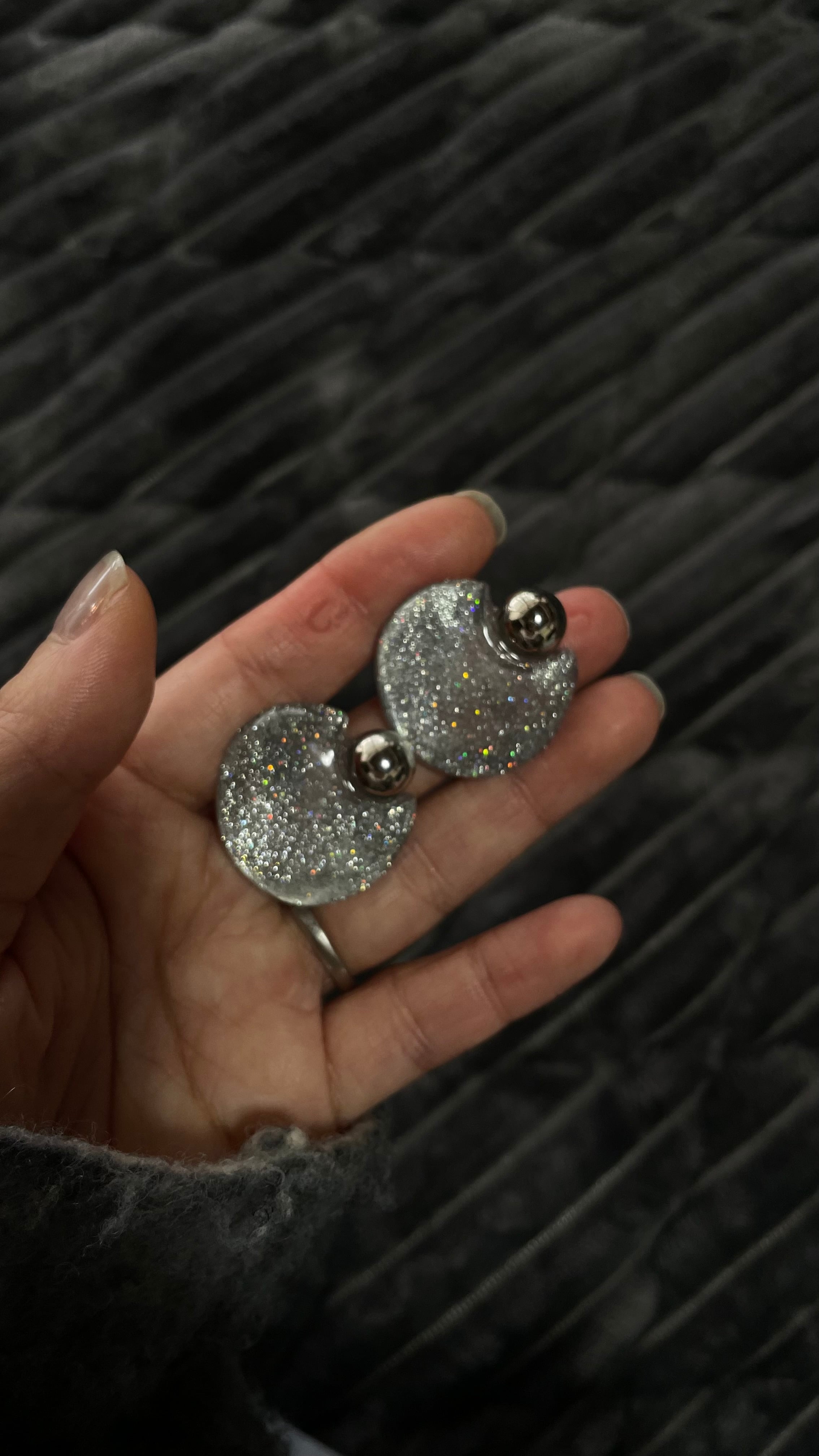 シルバーグリッターの細かな粒子が光をキャッチし、動くたびに繊細で多様な輝きを放ちます。